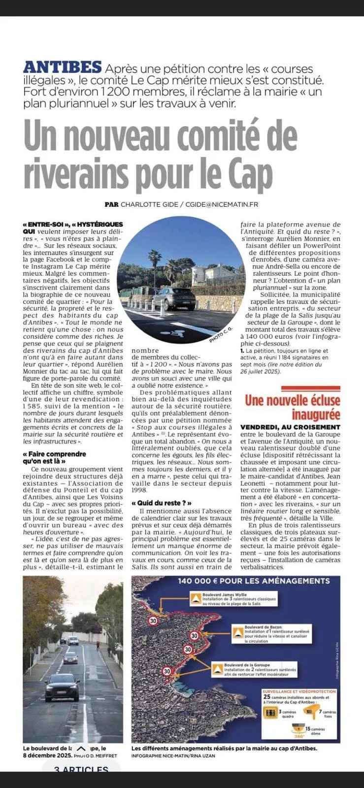 Le 30 octobre 2025, les services de la mairie ont présenté une série de mesures pour la sécurité routière et les infrastructures au Cap d’Antibes — radars, ralentisseurs, travaux d’assainissement… À ce jour, les habitants n’ont toujours aucune confirmation écrite, aucun budget voté, aucun calendrier public.